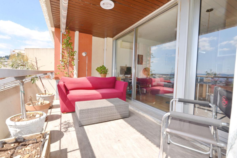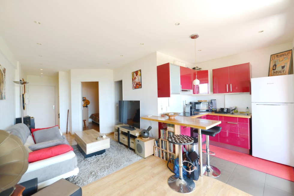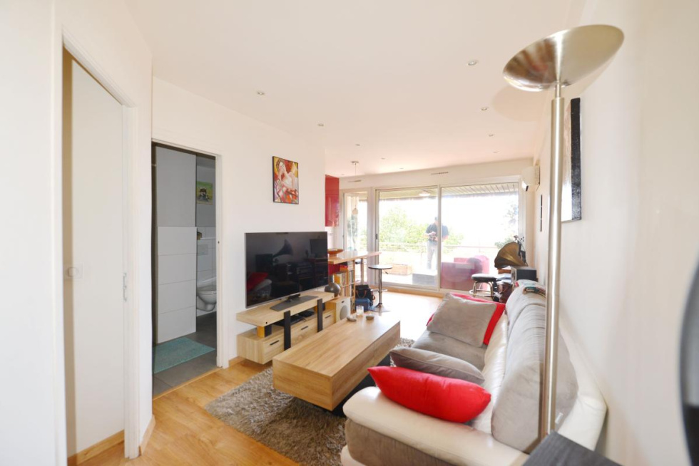 Vous disposez d'une entrée, espace séjour cuisine aménagée accédant à une terrasse exposée sud avec vue très agréable jusqu'à la mer, espace nuit avec placard, salle d eau, climatisation réversible, double vitrage.